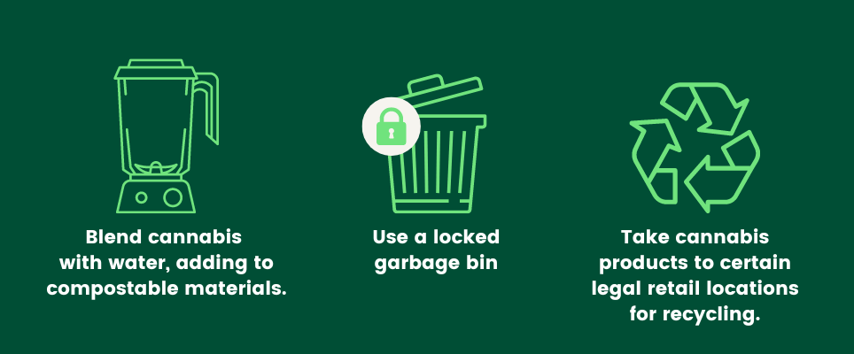 Make sure to dispose of products safely—when you are done with your cannabis products, make sure to dispose of any packaging, leftover product or paraphernalia away from kids or pets—like a locked garbage bin or in its original and legal packaging. Some retail locations will have recycling options and you can also blend cannabis with water and add to any compostable materials.